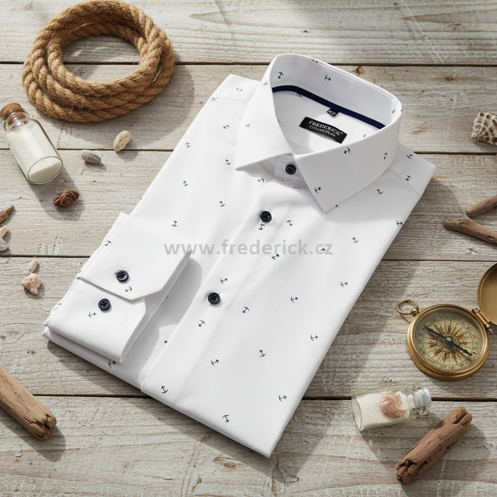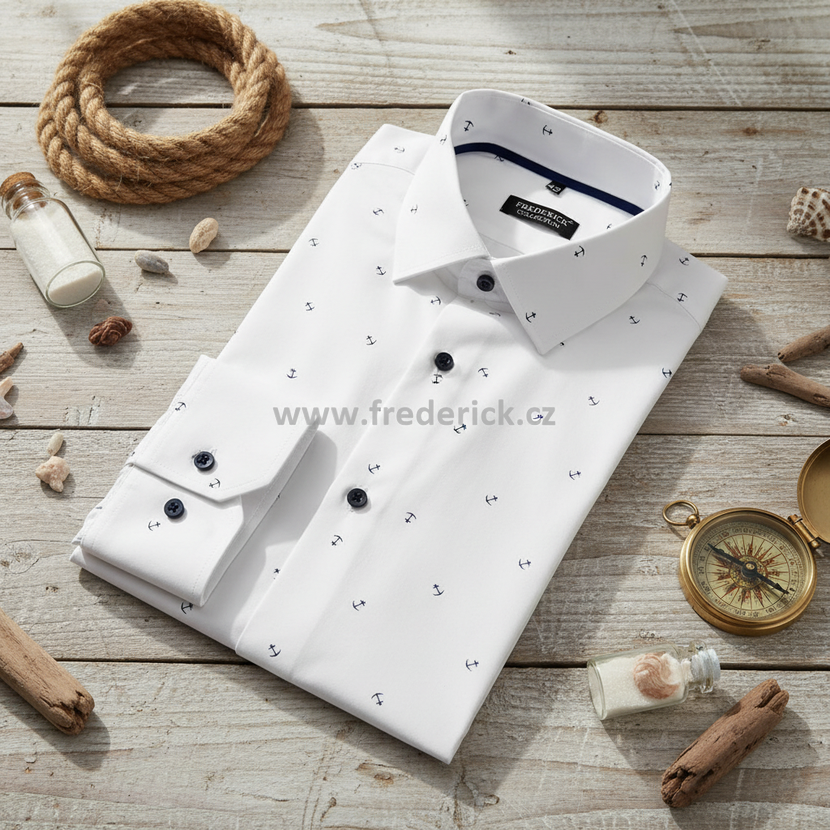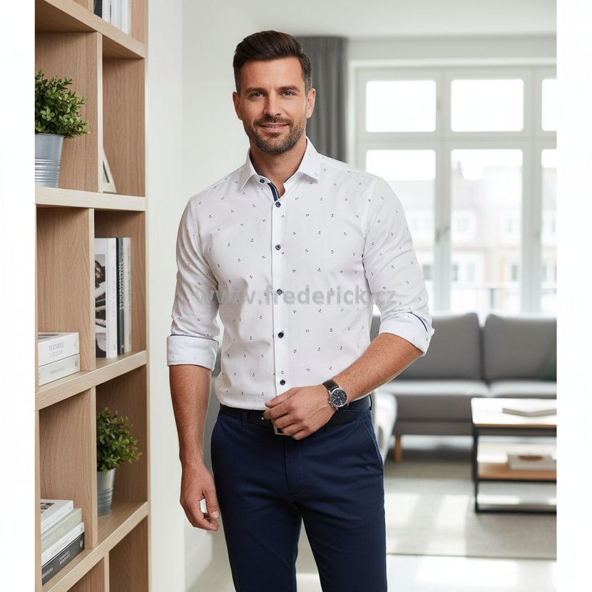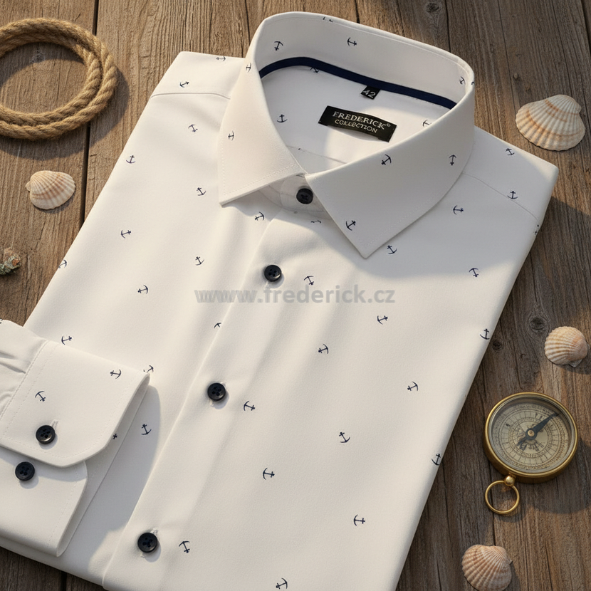 Krásná pánská košile s dlouhým rukávem příjemné bílé barvy s elegantním vzorem kotvičky je vhodná pro všechny příležitosti, pro muže všech věkových kategorii.