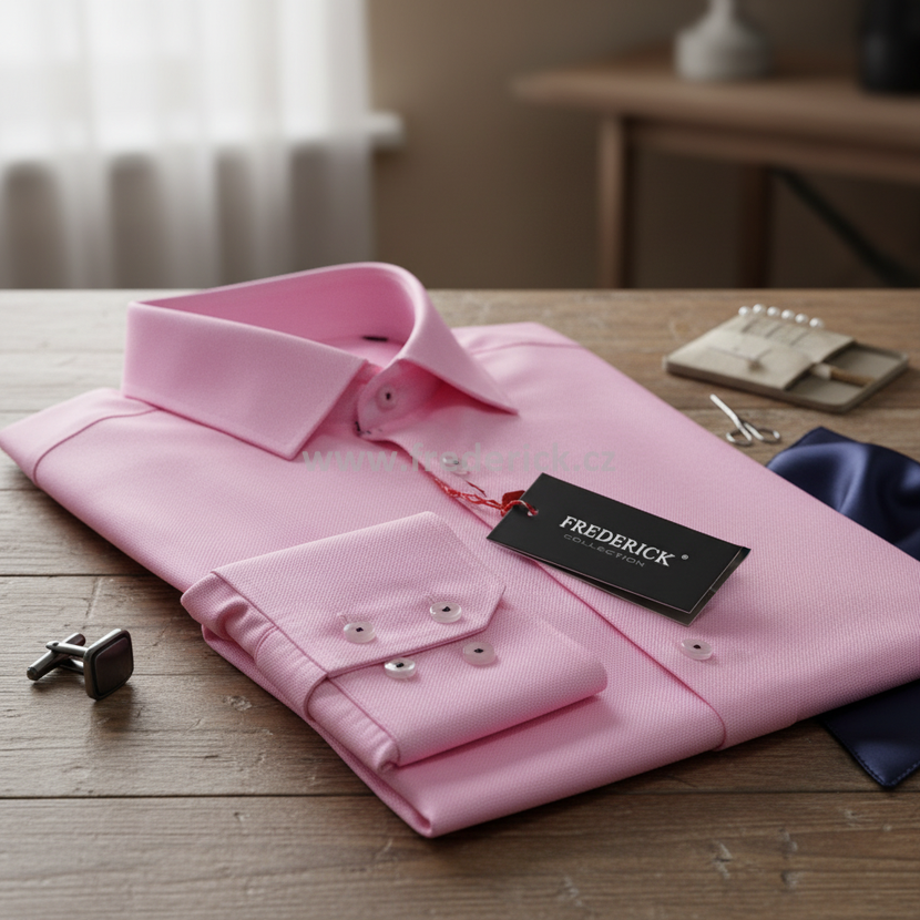 Knoflíky košile jsou světle růžové barvy přišité tmavě modrou nití což úžasně ladí s barvou košile.