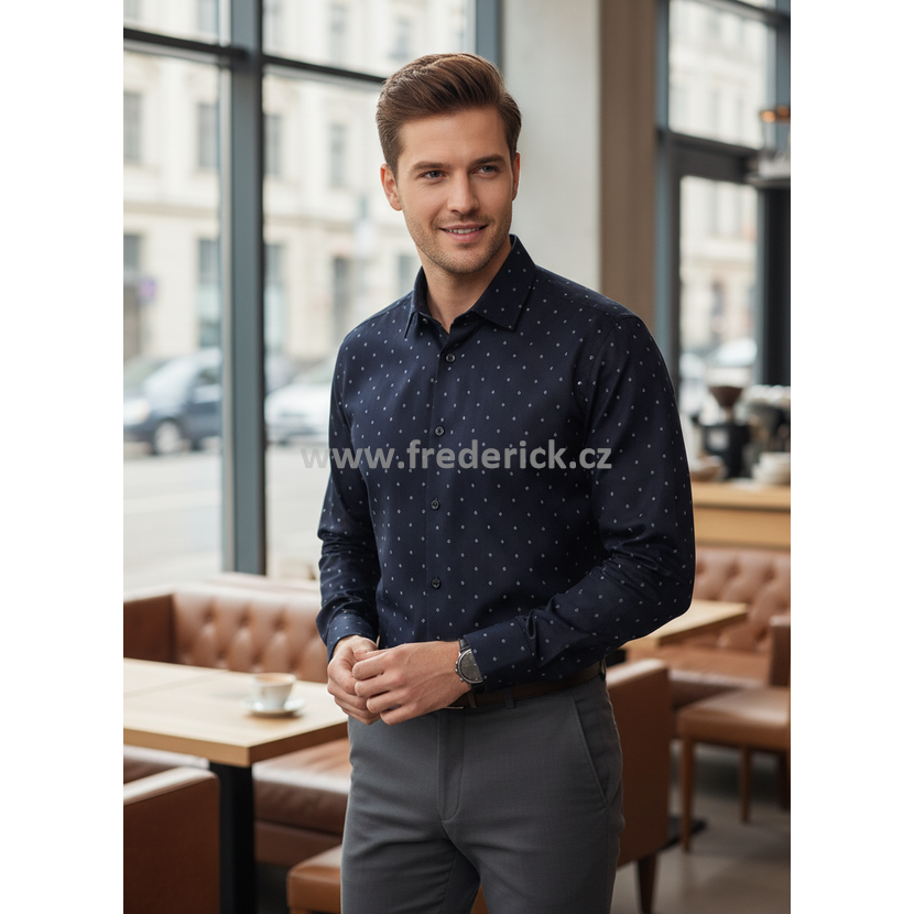 Pánská košile s dlouhým rukávem, elegantní tmavě modré barvy s krásným, jemným vzorem světle modré barvy v látce.