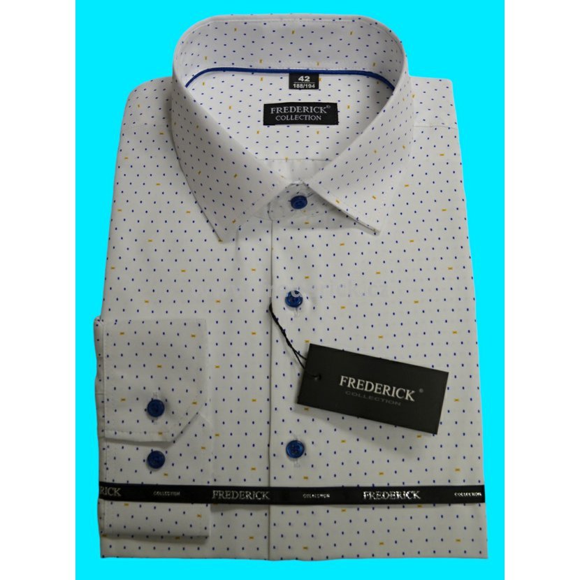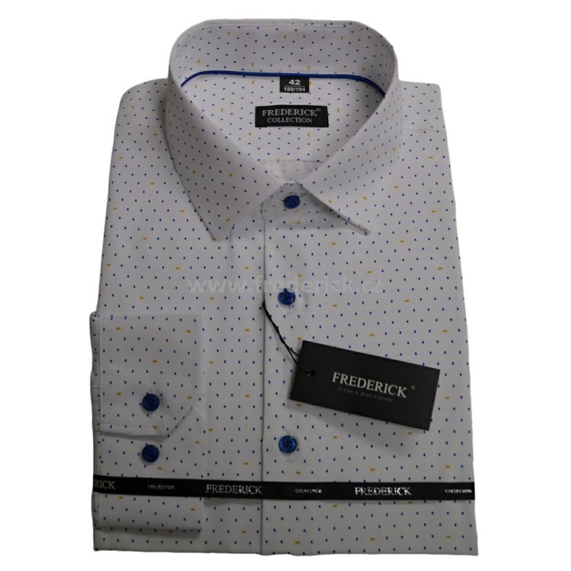 Pánská košile s dlouhým rukávem s prodlouženou délkou rukávu na výšku 188/194 cm bílé barvy s příjemným vzorem modré zlaté, žluté barvy.