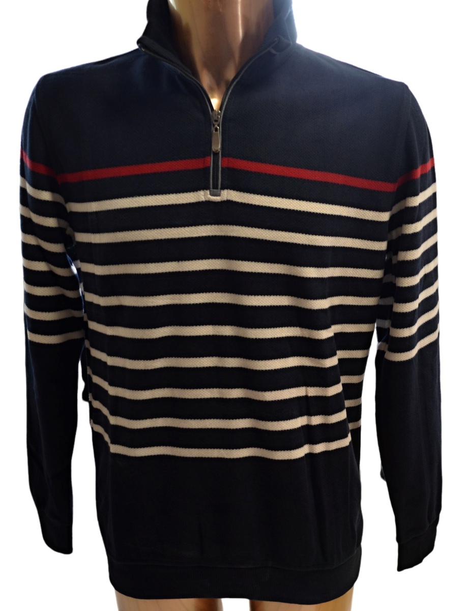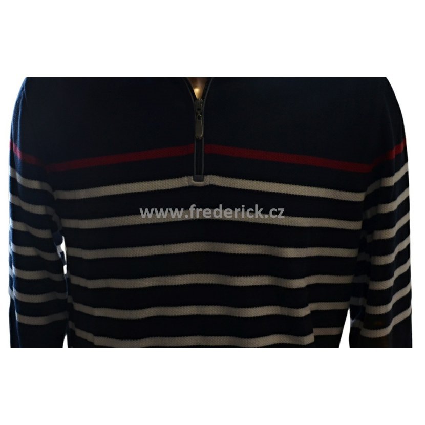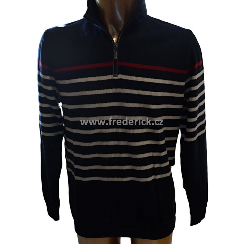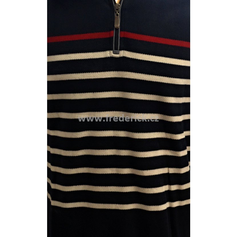 Moderní, pánská mikina, u krku na zip, v tmavě modré barvě s příjemným bílým a červeným pruhem na hrudi.
