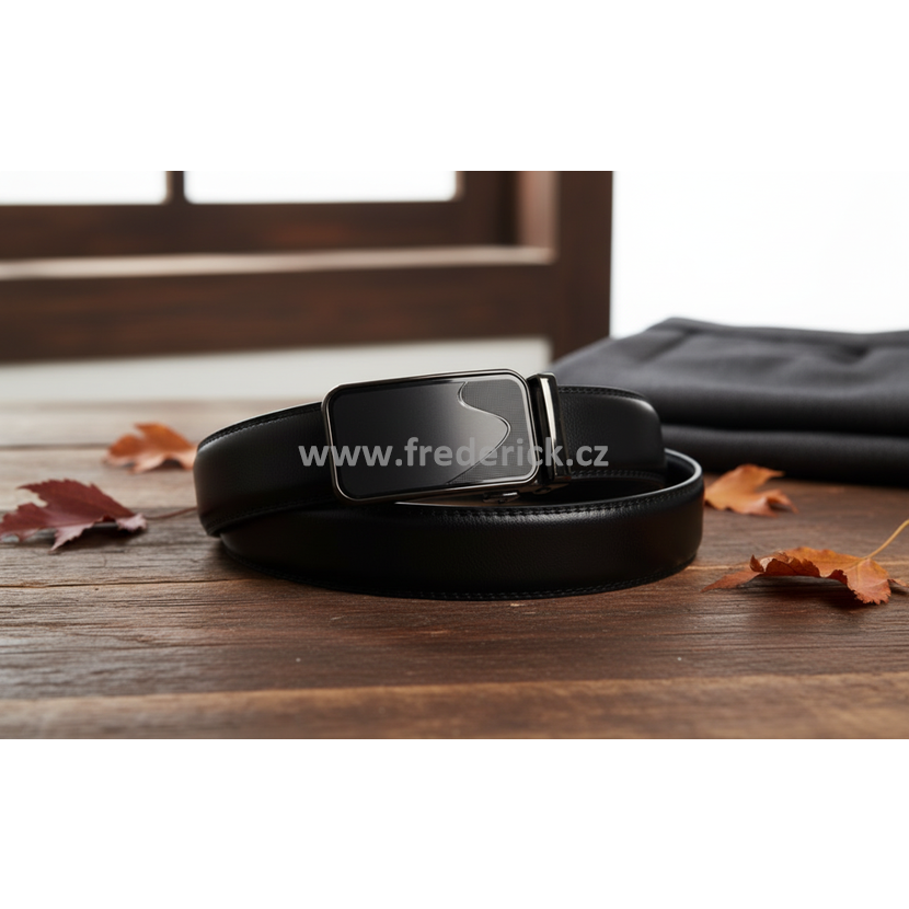 Pánský kožený opasek černé barvy s kovovou sponou krásné černé barvy s příjemným vzorem v decentním, matném provedení.