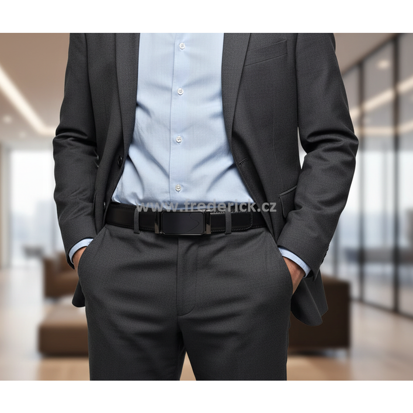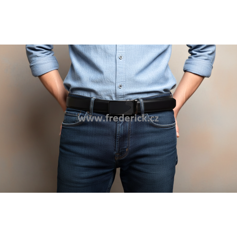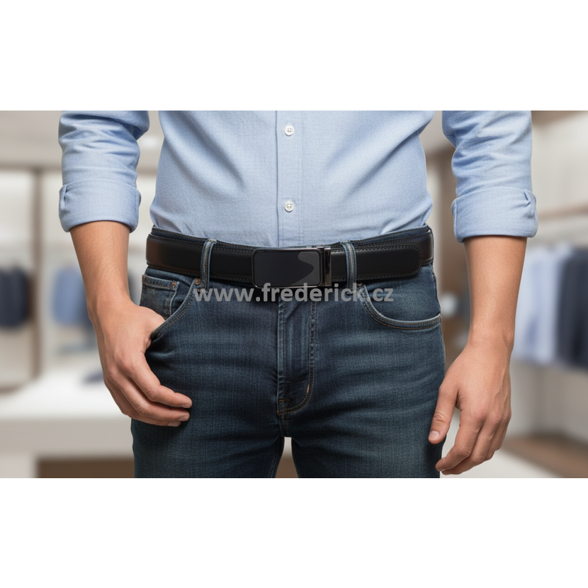 Elegantní pánský kožený opasek černé barvy s velmi kvalitní sponou černé barvy je vhodný pro muže všech věkových kategorii.