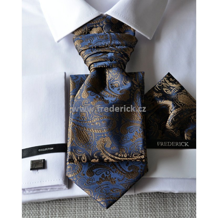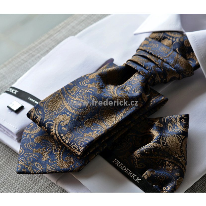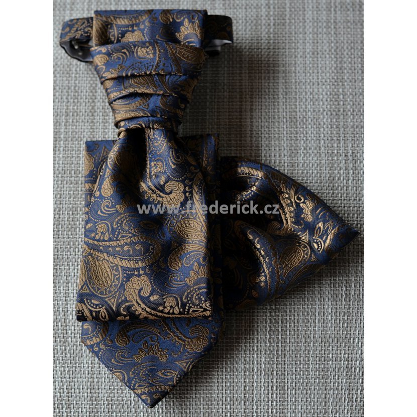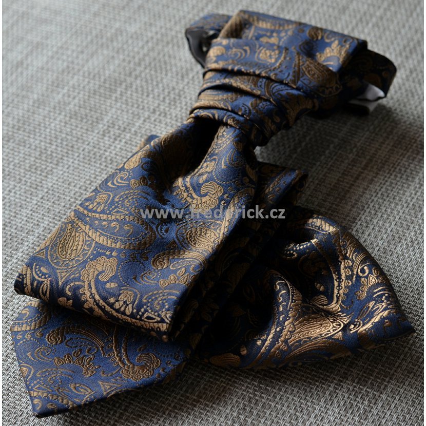 Pánská kravata (regata): vzor 52 - tmavě modrá barva v kombinaci s lesklým vzorem (ornamenty světle hnědé barvy). Součástí setu je kapesníček do kapsy saka nebo vesty.