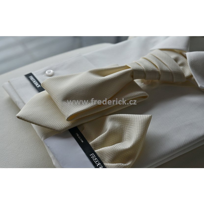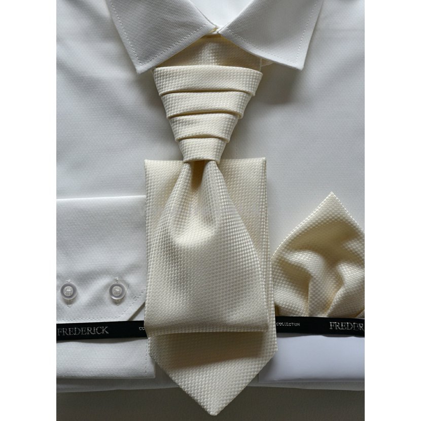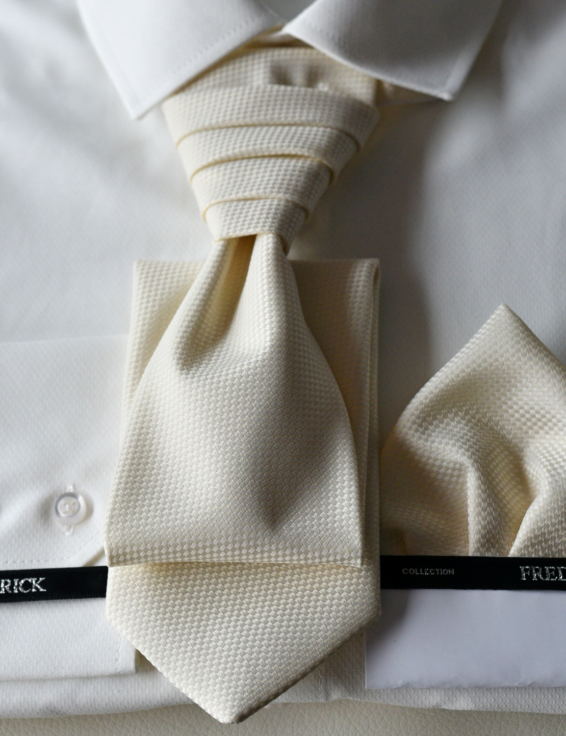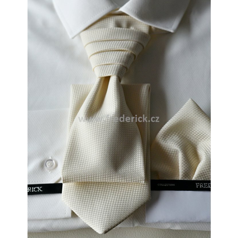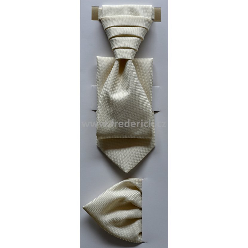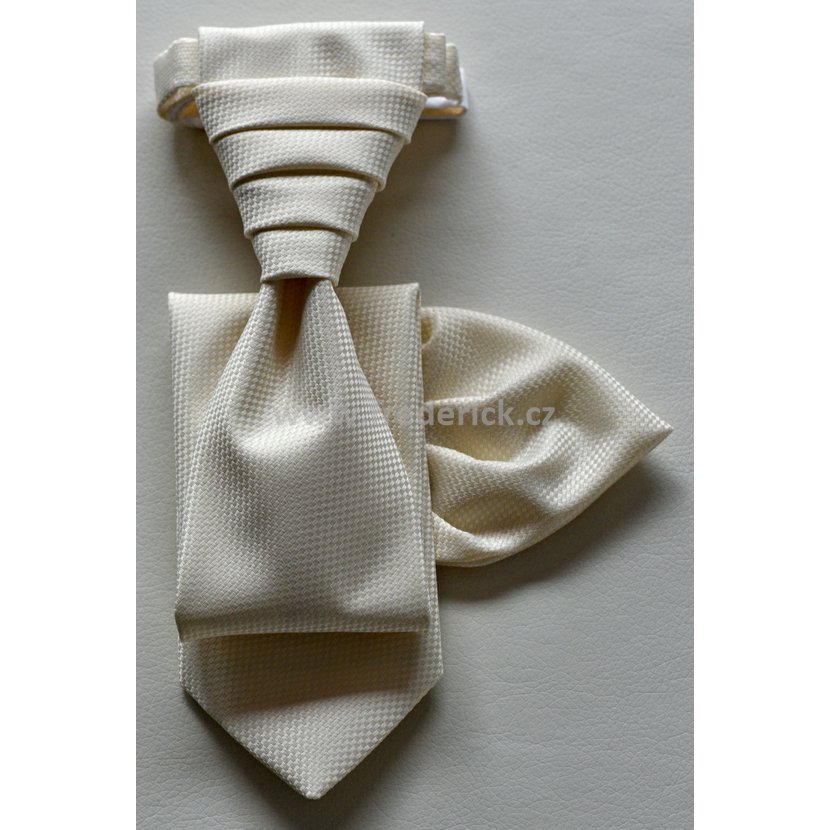 Pánská kravata (regata): vzor 61 - smetanová (šampaň) v kombinaci s lesklým vzorem (stejného odstínu smetanové barvy). Součástí setu je kapesníček do kapsy saka nebo vesty.